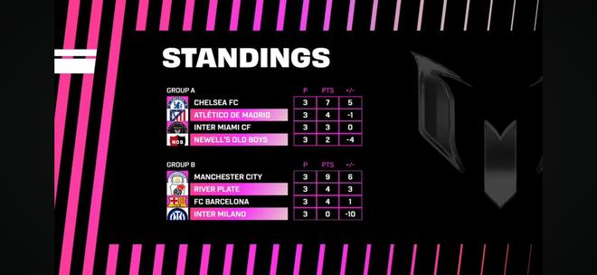 8支球队分为两组展开较量,A组为迈阿密国际、纽维尔老男孩、马竞和切尔西;B组包含巴萨、河床、曼城和国际米兰。